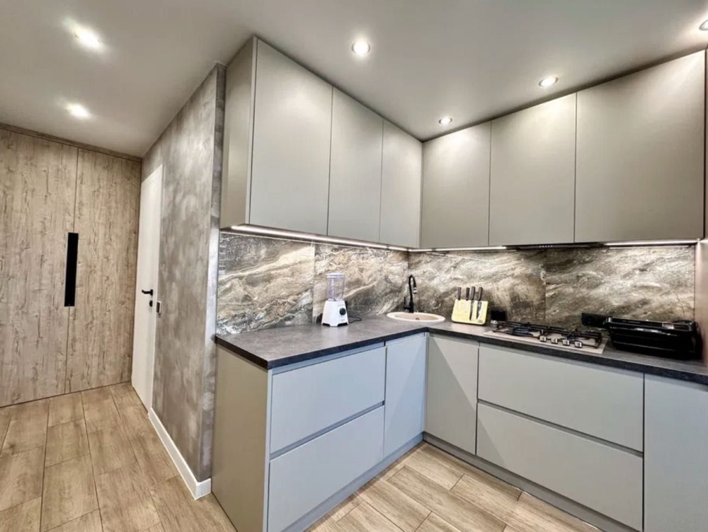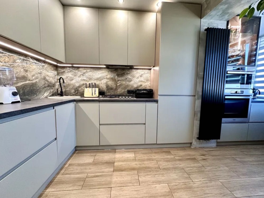 Вбудована кухня з фарбованими МДФ панелями.