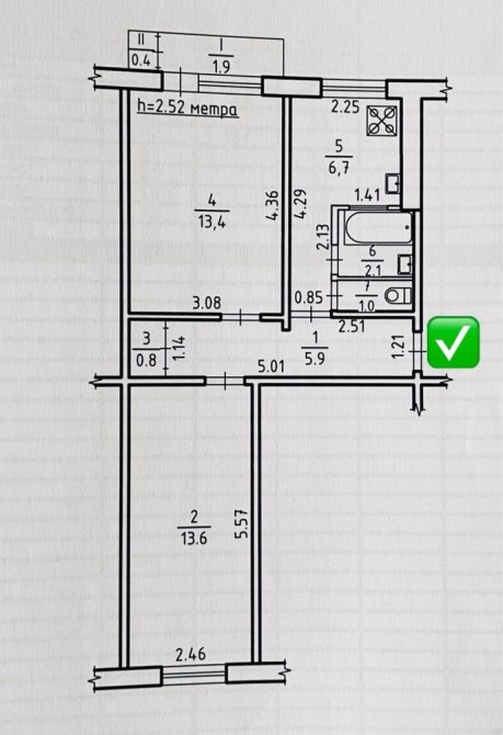 • Площадь кухни 6.7 м2