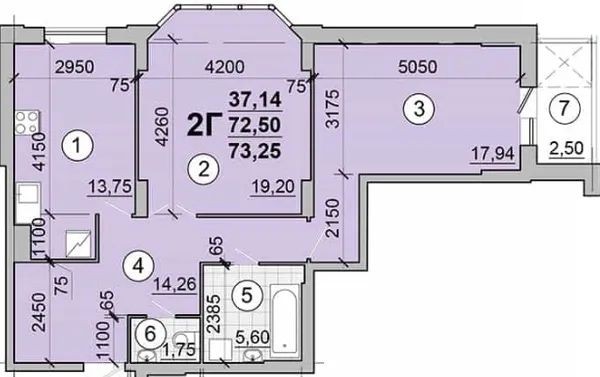 Двокімнатна квартира загальною площею: 73,25 м;