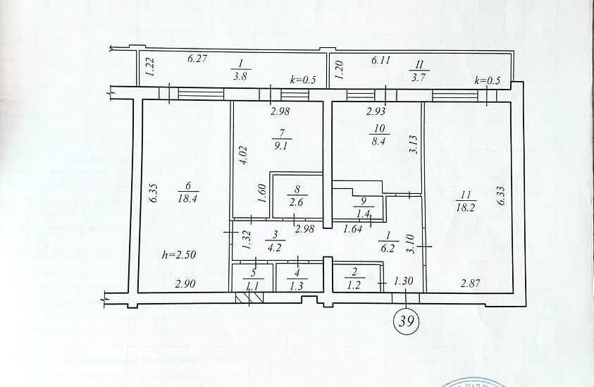 Две большие комнаты - 18,2 и 18,4 м.кв., третья комната - 8,4 м.кв., между ними кухня - 9,1 санузлы раздельные.