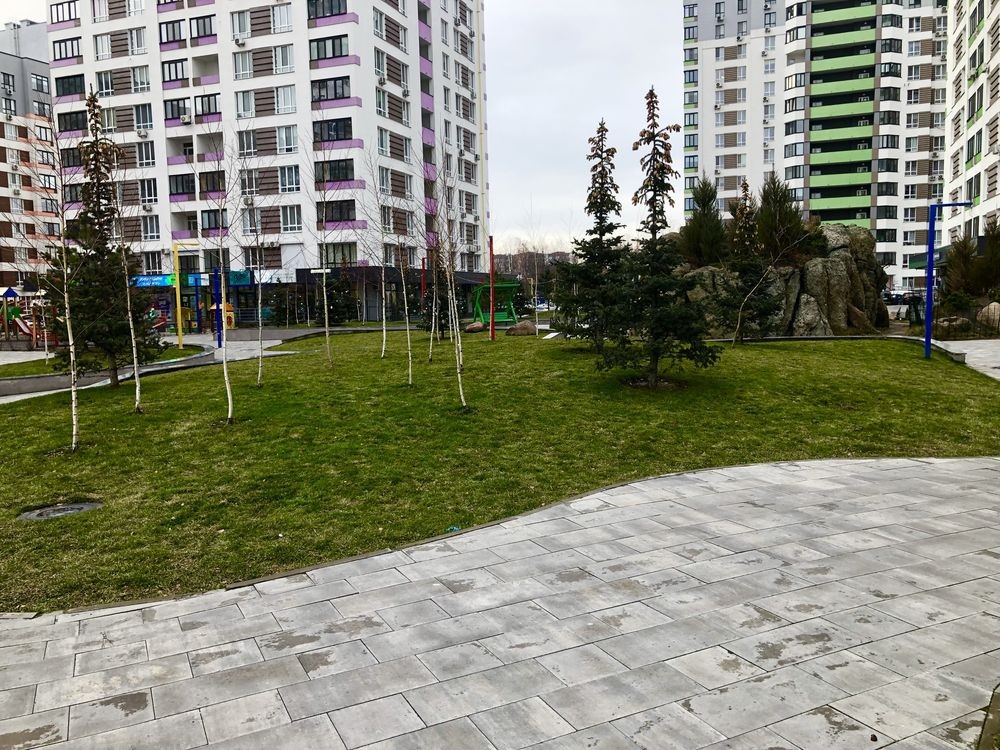 Двір облаштований для комфортного життя — сучасні дитячі майданчики, ландшафтний дизайн із зеленими зонами, акуратні доріжки, квітники, зручні лавки для відпочинку. Створено атмосферу затишку й гармонії.