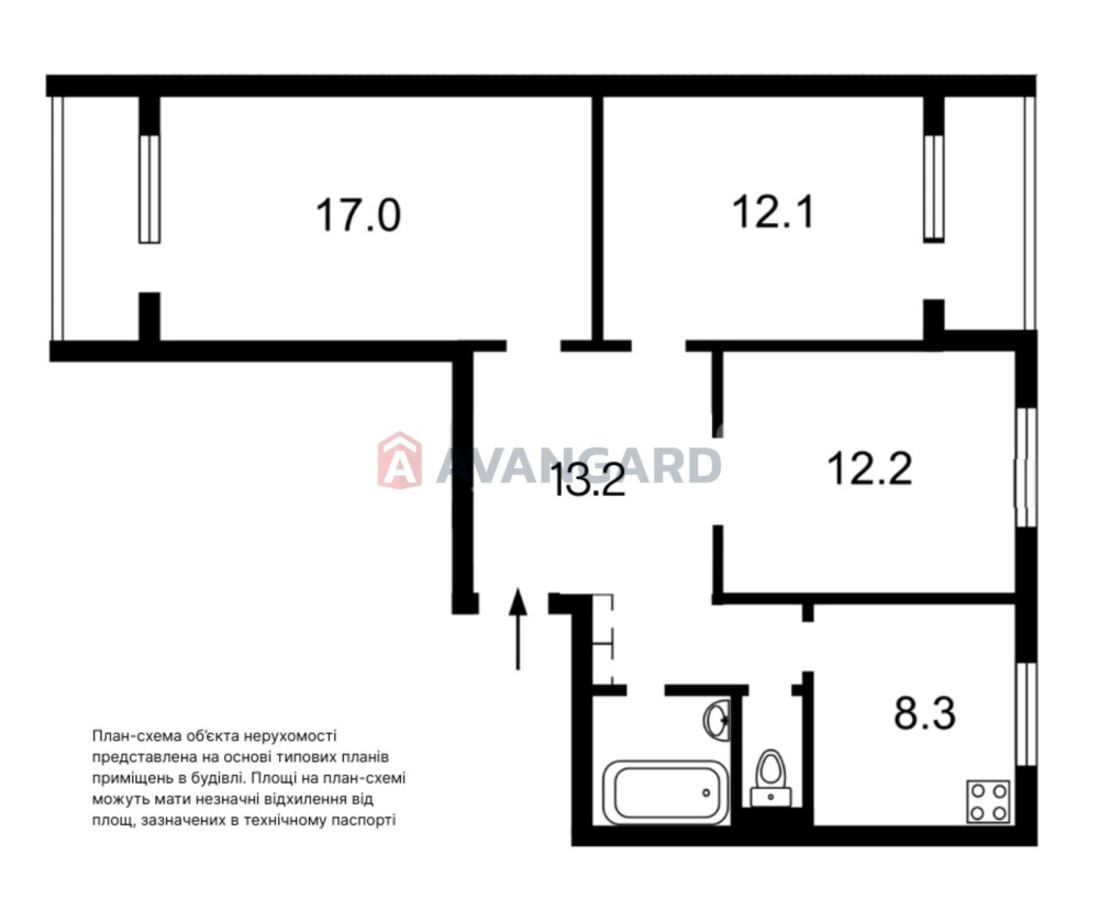 Планування: велика вітальня, дві окремі спальні, кухня, два засклені балкони, роздільний санвузол, передпокій, дві окремі комори на поверсі — додатковий простір для зберігання