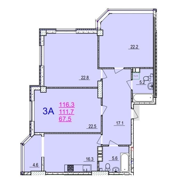 Загальна площа квартири 116,3 кв.м., житлова - 67,5 кв.м., кухня- 16,3 з виходом на лоджію 4,6 кв.м., 2 с/в. - 5,6 кв.м. + 5,2 кв.м.