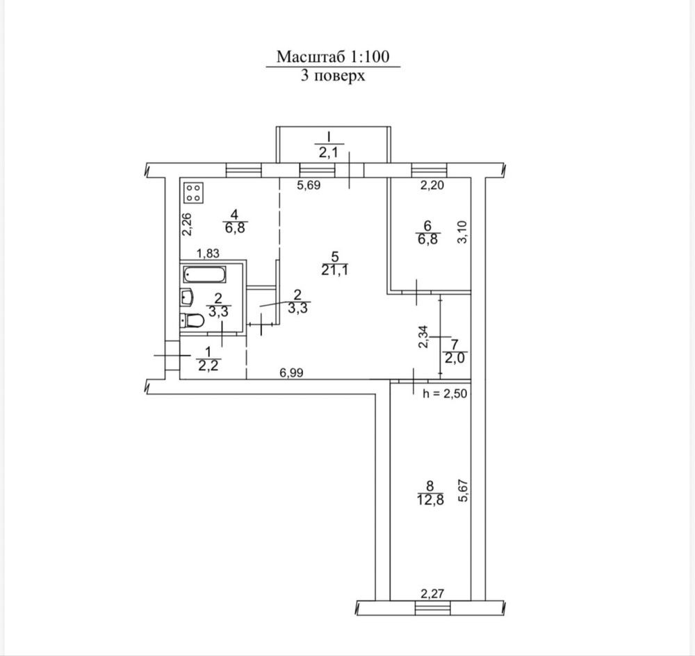 • Площадь кухни 6.8 м2