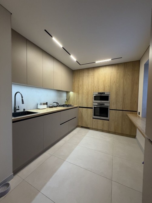 Кухня оборудована встроенной техникой премиум-сегмента: холодильник, посудомоечная машина, духовой шкаф, плита, вытяжка, свч. Вся встроенная мебель выполнена по индивидуальному проекту и идеально вписывается в интерьер.