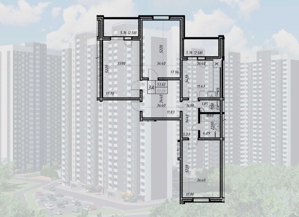 Площа: 93.29м² (житлова: 53.62м² / кухня: 11.47м²)