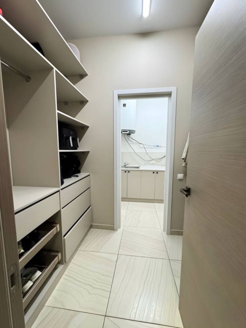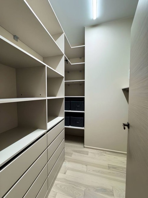 кухня-гостиная, хозяйская спальня со своей гардеробной, всего 3 спальни, 2 ванные комнаты (одна из них с сауной), 2 гардеробные, техническая комната с стиральной и сушильной машинами.