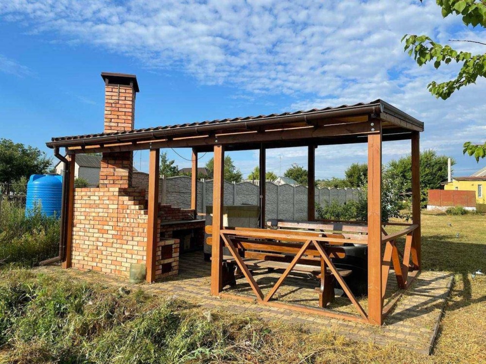 У дворі велика альтанка 2020 року, з кам'яною піччю, меблями.