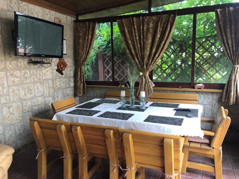 Є окрема зимова бесідка з каміном, ронтангові меблі з дуба. Стіни і камін з каменя.