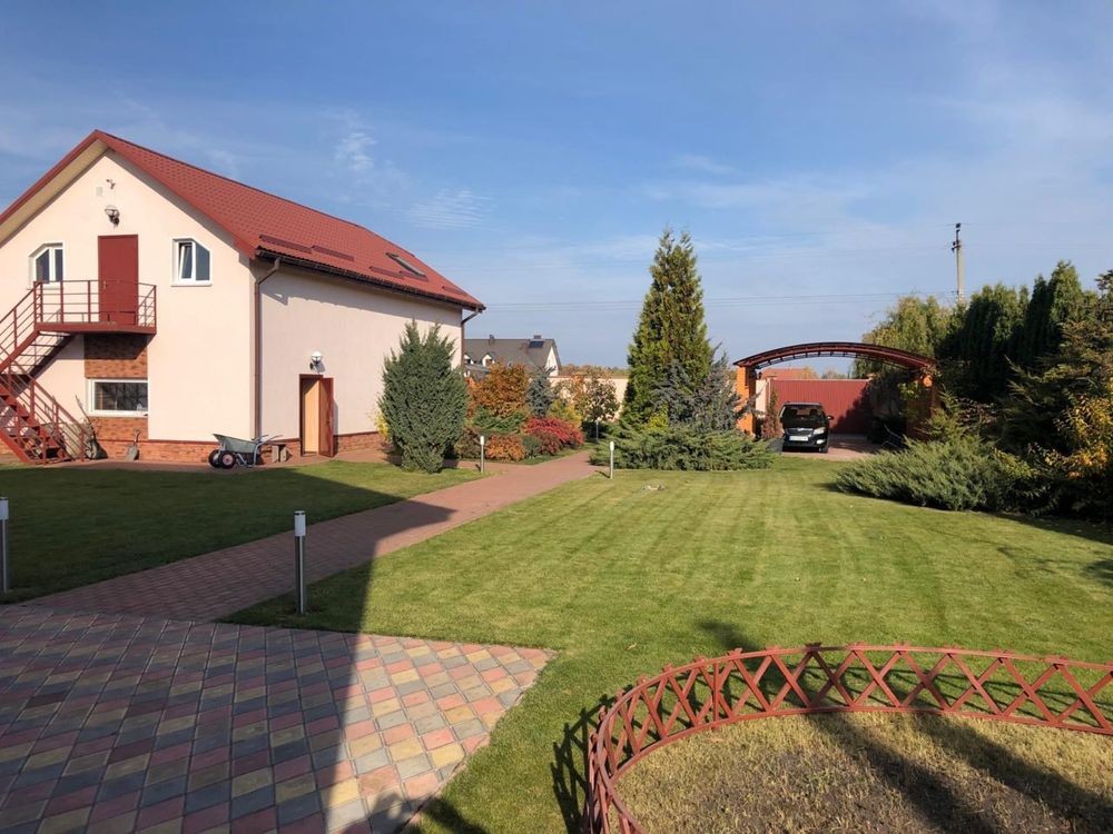 На території знаходиться будинок загальною площею 237м2. Повністю укомплектований технікою та меблями, зроблений дорогий ремонт з якісних матеріалів. В будинку два житлові поверхи та цокольне приміщення. На першому поверсі гостьова кімната, санвузол, вітальня, кухня та обідня зона з виходом до бесідки. В вітальні встановлений електричний камін, обкладений гранітом, дивани американські, ортопедичні. Стіни зроблені венеціанкою. В обідній зони меблі з натурального дерева та встановлена тепла підлога, кухня з червоного дерева. В санвузлі тепла підлога, сантехніка Роялті, оздоблена камінням Swarovski.