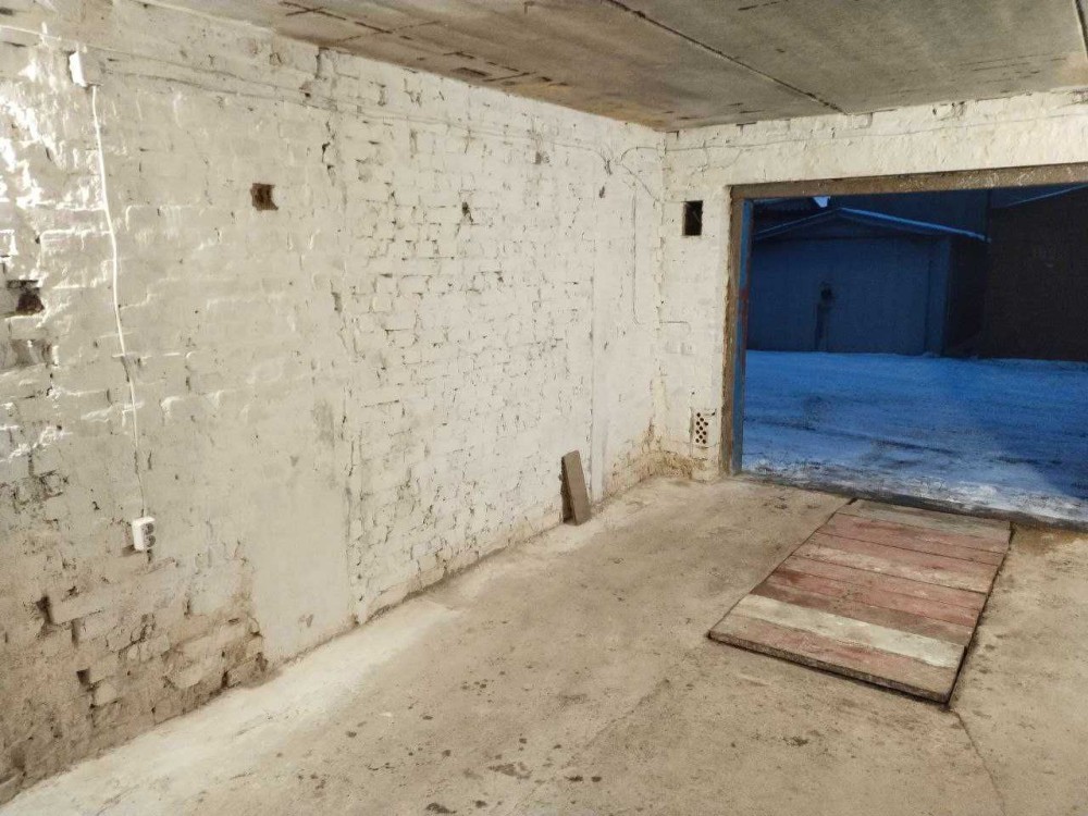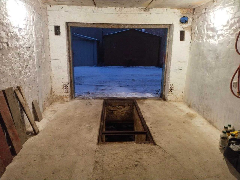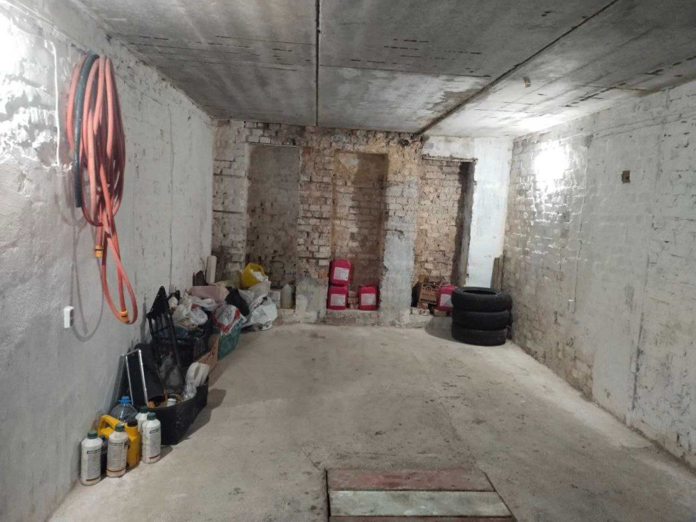 Перекриття — бетонне, стіни — цегляні. У гаражі підведено електропостачання. Є оглядова яма зі сходами в підвал. Підвал займає всю площу гаража та складається з кількох кімнат.
