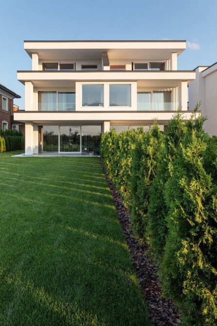 Полы с водяным подогревом (батарей нет!), котел Wiesmann; покрытие 1 эт — итальянский керамогранит, 2,3 эт — дубовый паркет; настенные панели — натуральный дубовый шпон; система Умный дом; Алюминиевые витражные окна; система двойной водоочистки; ТВ Sony 85″, 65″, 49″; сантехника Hansgrohe, Grohe, Geberit, Devit; кухня Rait с фасадами из натурального дубового шпона, столешница — мрамор, техника Miele; мягкая мебель Bonaldo; двери Elio. Лаунж-зона 3-го этажа оборудованна джакузи и сауной. Террасная мебель. Участок высажен травой и туями, оборудован автополивом.