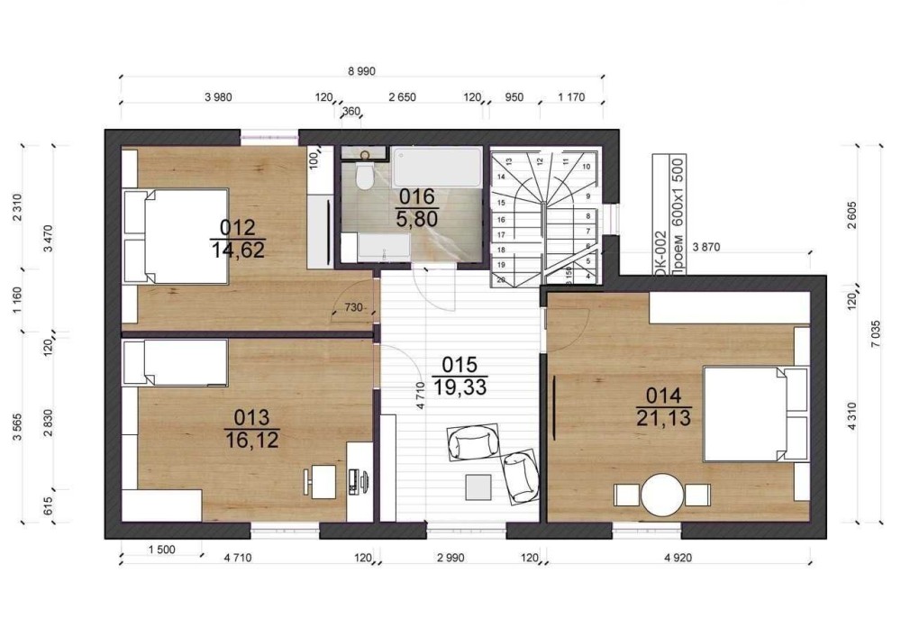 Второй этаж - три спальни, санузел душевая кабина.