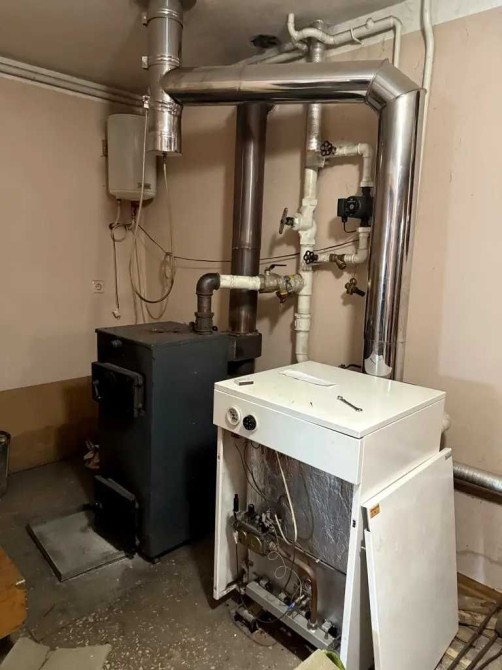 Отопление газовый и твердотопливный котел, вода- скважина, канализация септик.