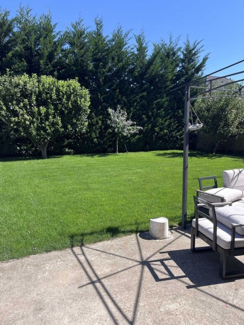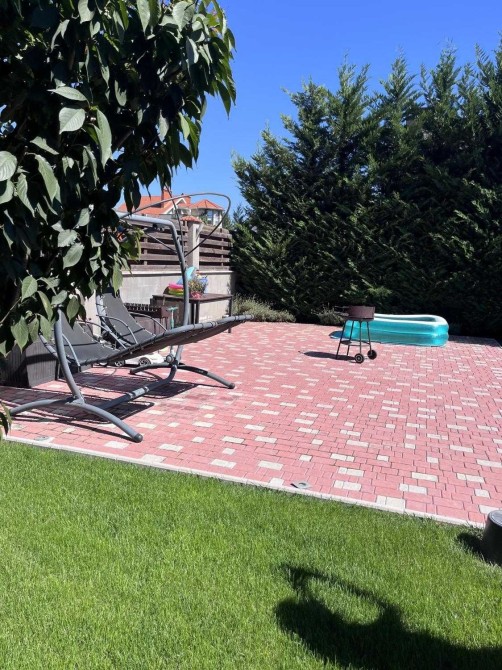 Двор с газоном и фруктовыми деревьями, система авто-полива, вкопана емкость для запаса воды на 2 куба, две террасы, место для 2-3 машины!
