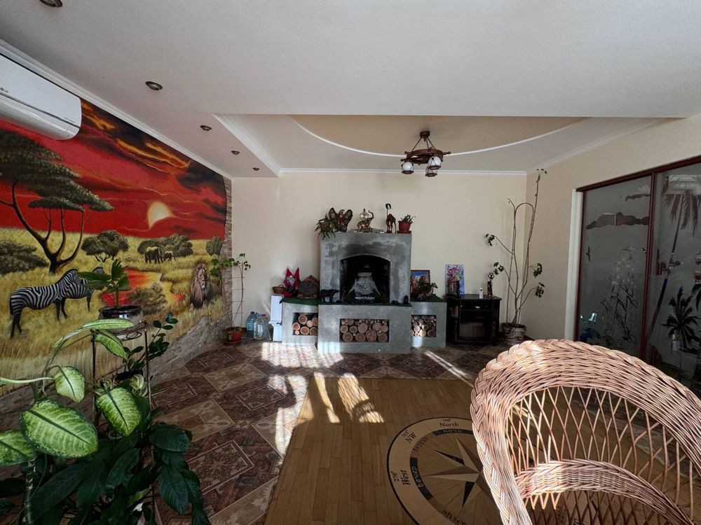 • Гостиная в тематике Африки: камин и авторская картина «Сафари», создающая атмосферу уюта и вдохновения.