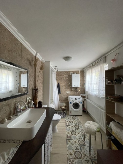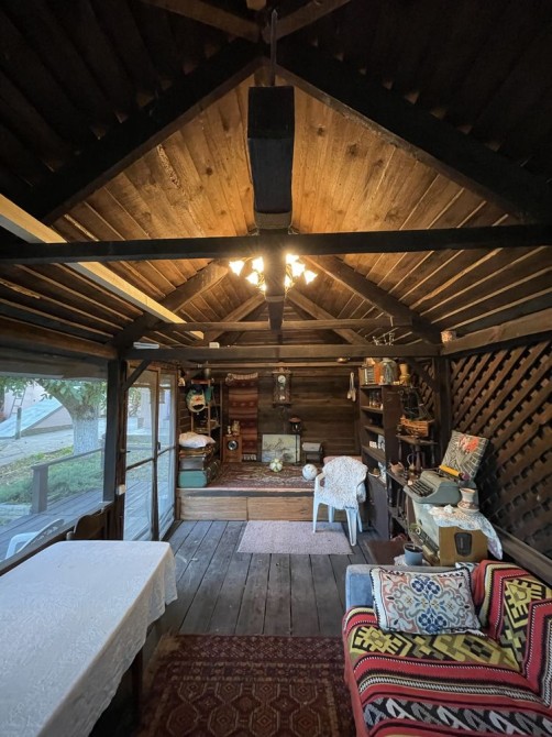 Основной дом площадью 50 кв.м полностью после капитального ремонта. В нём — современный санузел с окном, новая сантехника, газ, отопление и горячая вода от котла. Спальня компактная, но светлая, с видом во двор — идеальное место для отдыха.