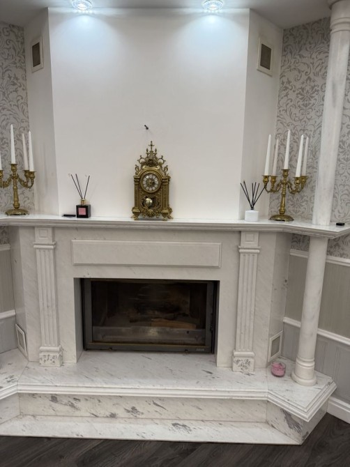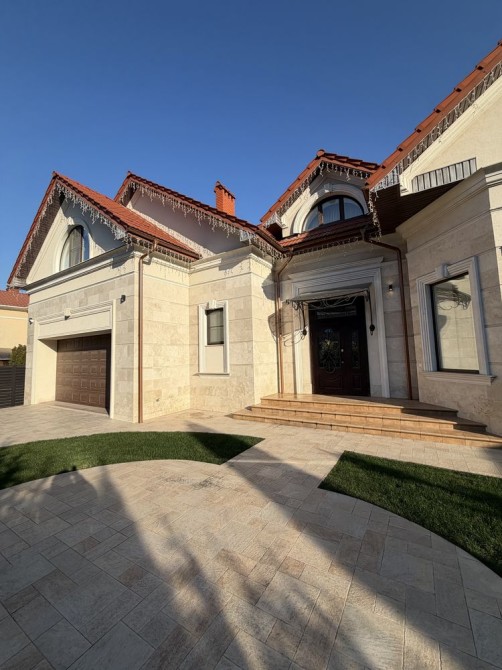 Дом облицован травертином, натуральная черепица, алюминиевые окна с евробрусом. Мраморная лестница с подсветкой, камин из натурального мрамора. Качественная сантехника и бытовая техника европейских брендов, кухня с кварцевой столешницей.