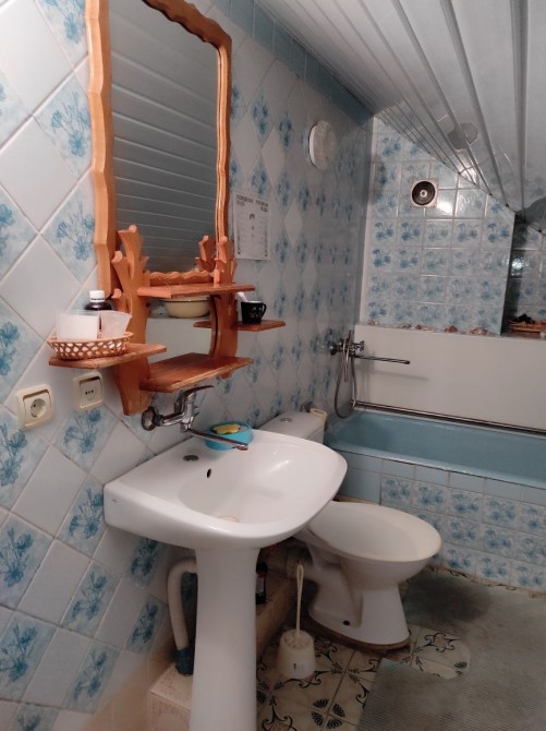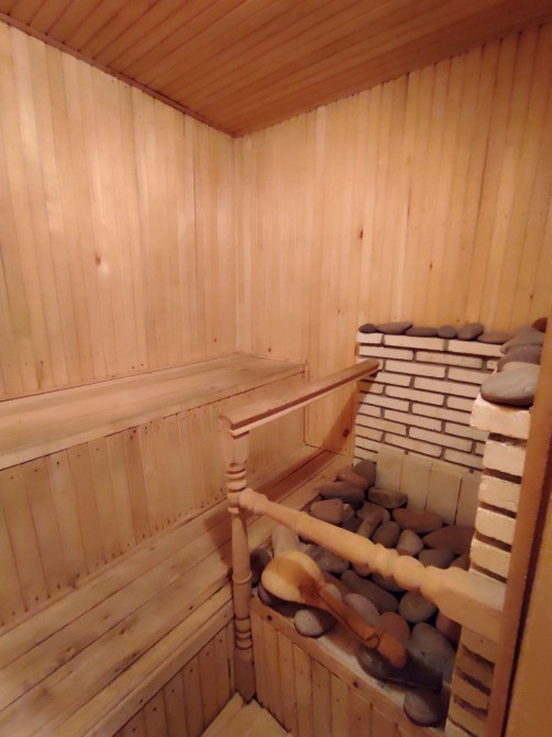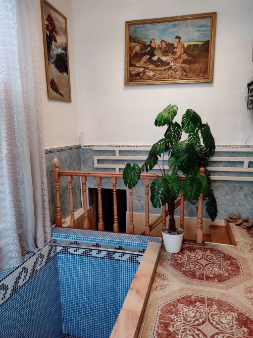 2 эт: большая кухня с кладовой, зал-столовая-гостиная с выходом на терасу во двор к берегу и видом на реку/лес, бассейн, душ, баня.
