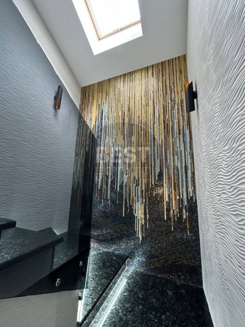 Уникальное мозаичное панно, инкрустированное золотыми вкраплениями, придает интерьеру неповторимый шарм и создают роскошную атмосферу.