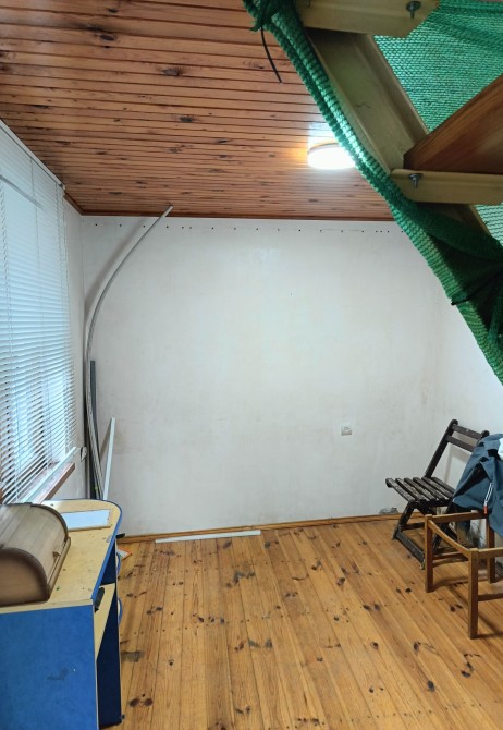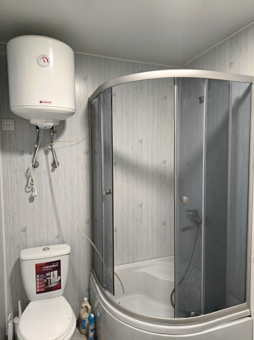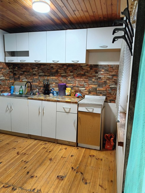 Первый этаж сделан из красного кирпича,второй этаж из каркаса.первый этаж кухня столовая,душ, туалет,бойлер.Есть септик на 4 куба.второй этаж 2 раздельные комнаты.