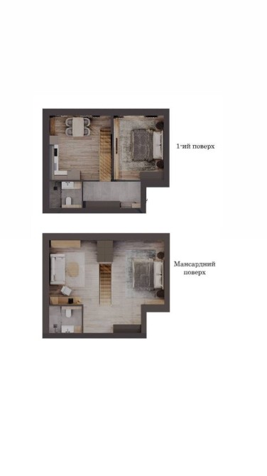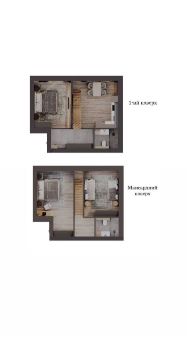 На першому поверсі велика кухня-вітальня 28м2, вхідна зона 7,1 м2 та санвузол, на другому поверсі спальня 15м2, дитяча 13м2, санвузол.