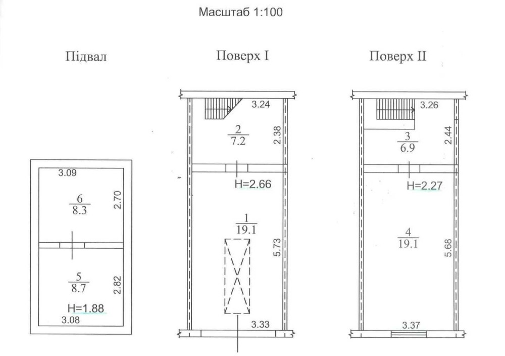 підвалу (Н=1,88 м): Підсобна – 8,7 м2, Підсобна – 8,3 м2;