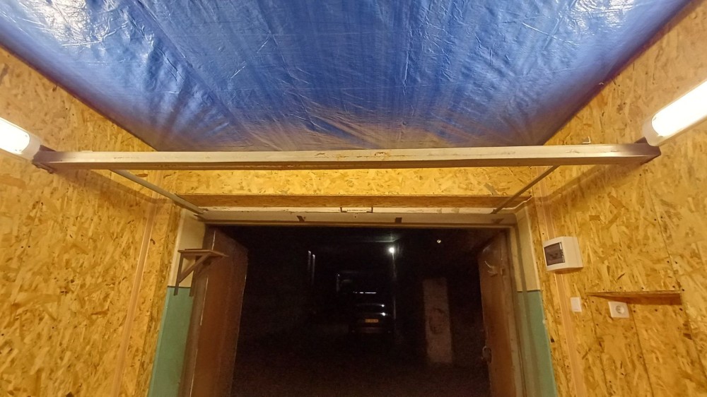 Двери утеплены пенопластом. В начале гаража полка под потолком - удобно хранить резину и прочее (нужно только положить доски, пока делал ремонт, доски нехорошие люди утащили)
