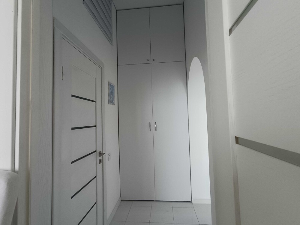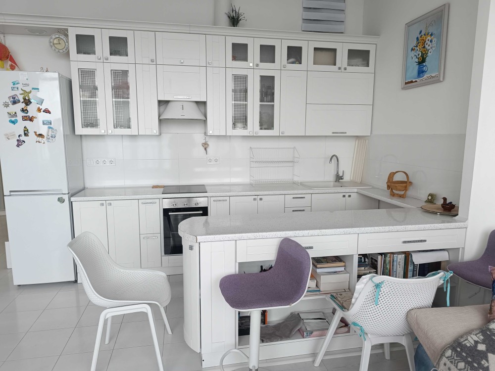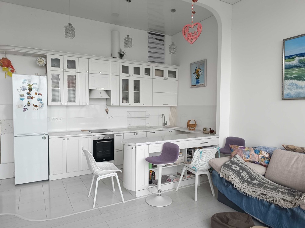 Квартира сделана в современном европейском стиле с использованием качественных материалов. Ее площадь 65 м², а высота потолков достигает 4 м, что создает ощущение простора и свободы. Особенностью этого жилья является большая терраса, с которой открывается захватывающий панорамный вид на море и действующий камин.