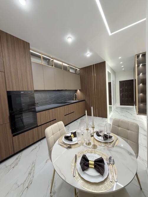 Кухня у комплекта абсолютно всем необходимым : посудомоечная машина, варочная духовая поверхность, духовой шкаф, вытяжка, микроволновая печь, множество мест для хранения