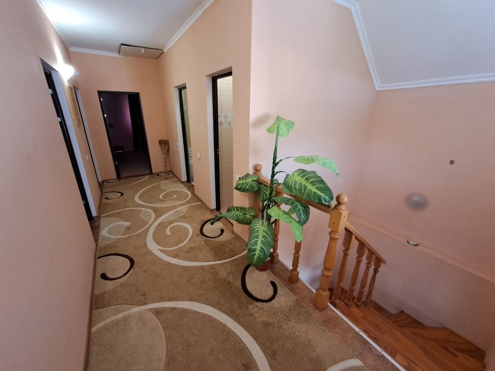 Продається будинок в Яремче, район Дора, загальною площею 240 м², перший поверх площею 100 м², площа земельної ділянки 0.23 га. Побудований в 2014 році, від центральної дороги до будинку 30 метрів. На території подвір'я розташовані будинок, літня кухня, сарай, криниця і септик. Бетонний фундамент у будинку кухні і сараю. Перший поверх має стіни з дерева та частково з цегли, другий і третій поверх - дерев'яні. Заведені комунікації: газ, світло, вода. У будинку є твердопаливна піч, газовий двоконтурний котел для гарячої води і опалення, а також вся необхідна побутова техніка. Підлога в будинку дерев'яна. Сходи до будинку з вулиці бетонні, на другий поверх - дерев'яні. Зовні будинок утеплений мінватою та опшитий частково металом, частково дошками. Вікна встановлені металопластикові двокамерні. Перекриття у будинку дерев'яне, покриття даху - металочерепиця. Перший поверх будинку повністю зроблений житловий ремонт, другий і третій мансардний поверх потребують ремонту.
