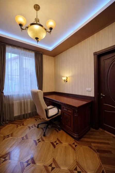 Кабинет с качественной мебелью из красного дерева, гостевой санузел.
