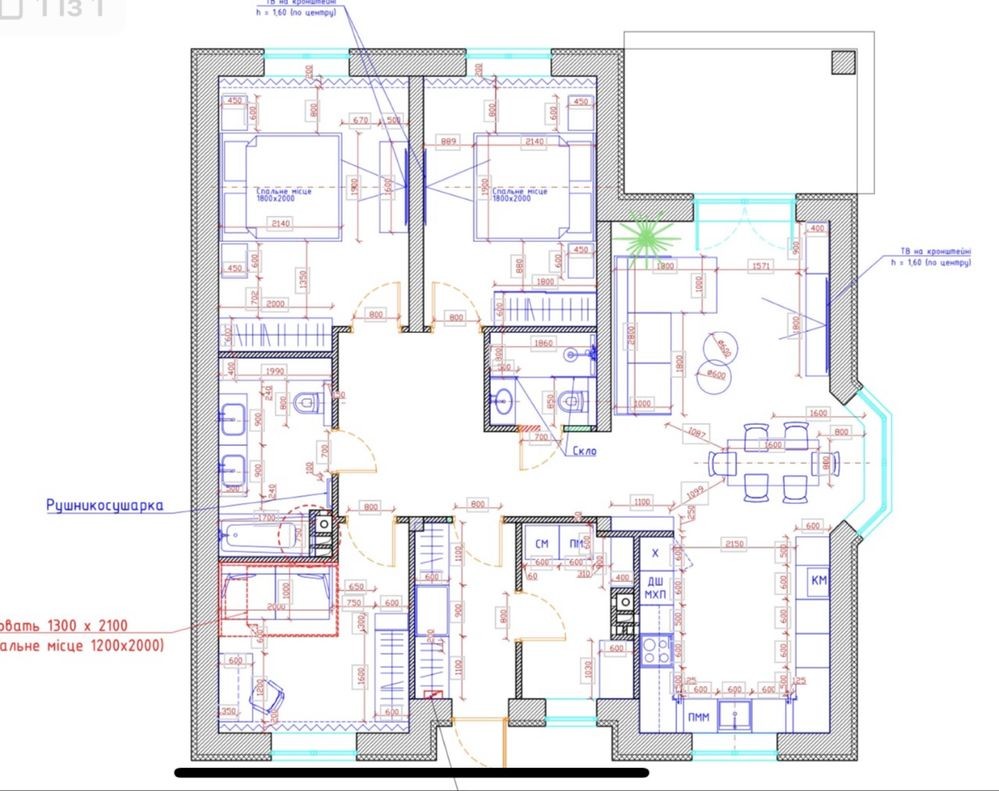 Планування: вітальня з виходом на терасу, три окремі спальні, два санвузли, котельня.