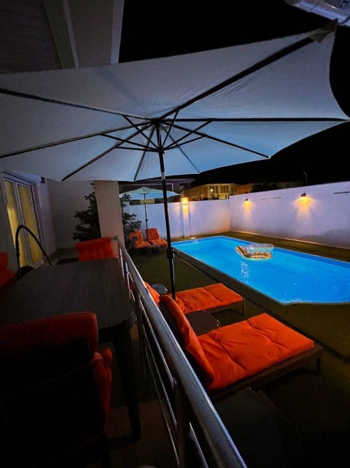 Чудовий, затишний новий будинок. Загальна площа 250 кв. м. 4 роздільні спальні. Будинок повністю оснащений технікою, посудом, постільна, кондиціювання, мангал, і все, що потрібно для зони барбекю. Шезлонги.