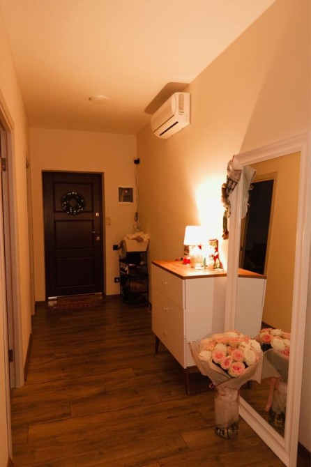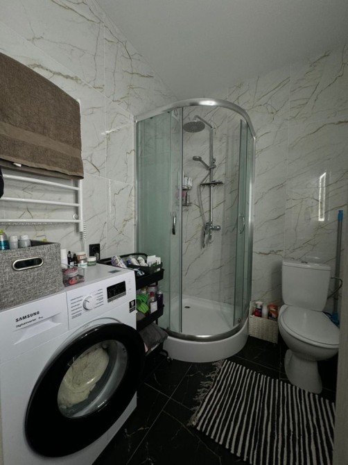 Простора ванна кімната з душовою кабіною, пральною машиною, бойлером, сучасною сантехнікою та зручними поличками для зберігання речей. У квартирі встановлено індивідуальне газове опалення, теплу підлогу в кухні та ванній, лічильники на всі комунікації, кондиціонер, інтернет. Коридор з дзеркалом у повний зріст, комодом і додатковим освітленням, а також зручний балкон із панорамними вікнами.