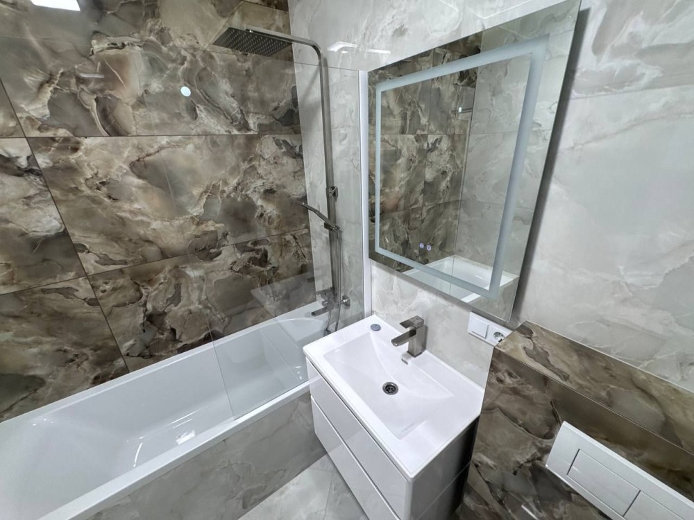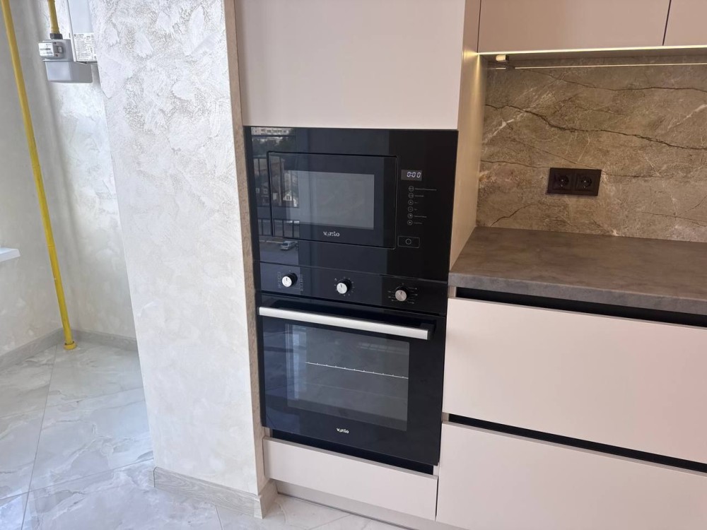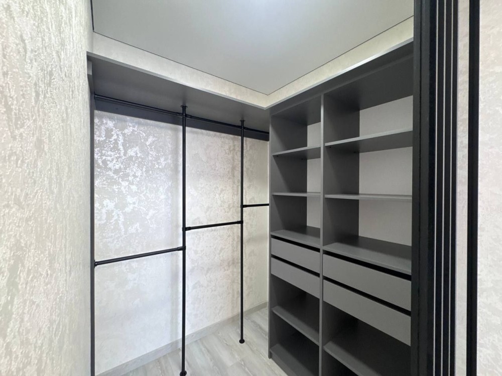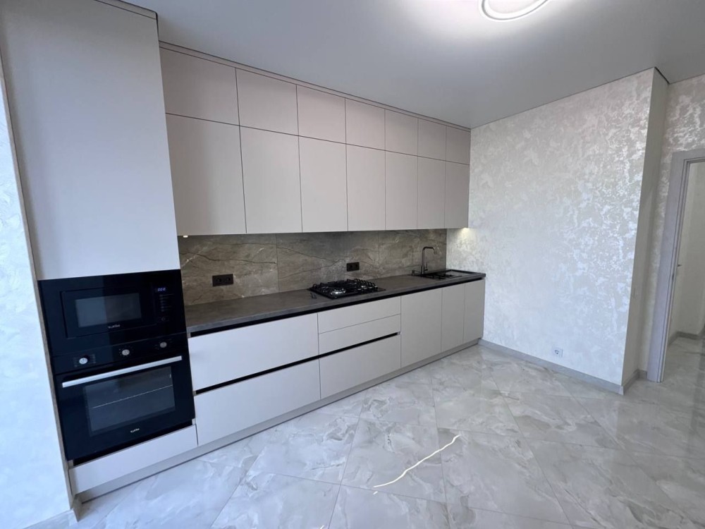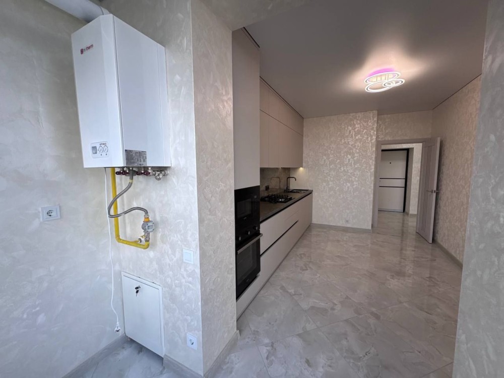 Квартира абсолютно нова – ніхто не проживав. Виконана з якісних дорогих матеріалів, автономне газове опалення, теплі підлоги (там, де плитка), сучасна кухня з вбудованими меблями та технікою, велика гардеробна, балкон на дві зони: засклений і відкритий.