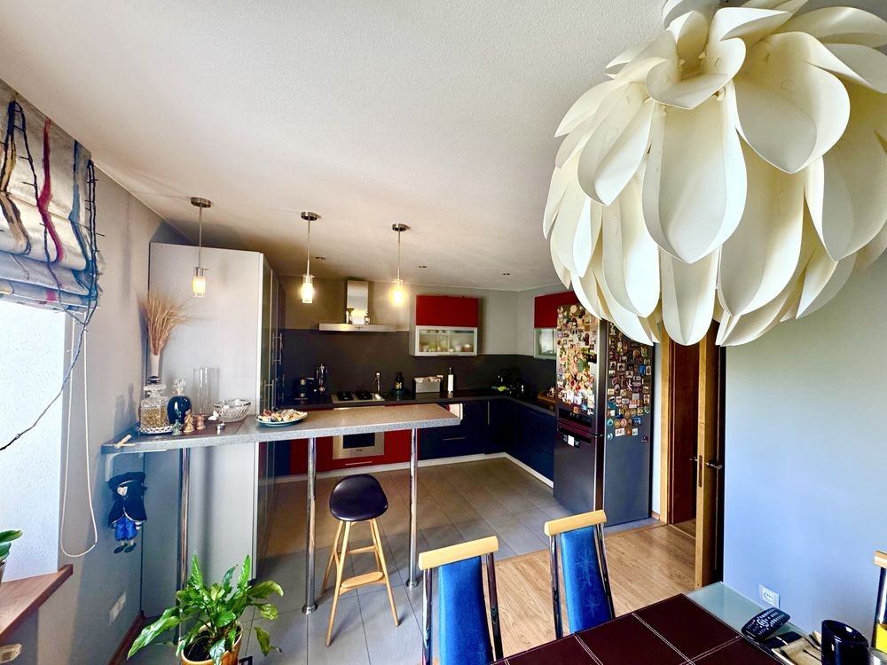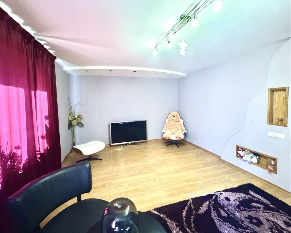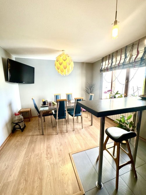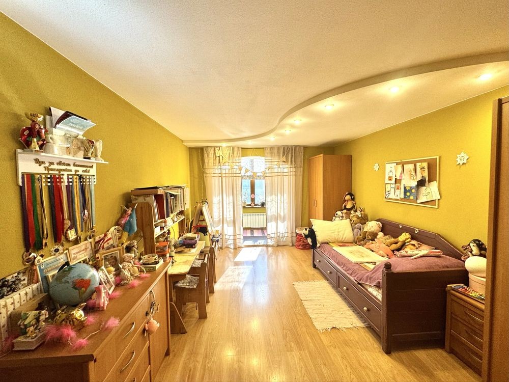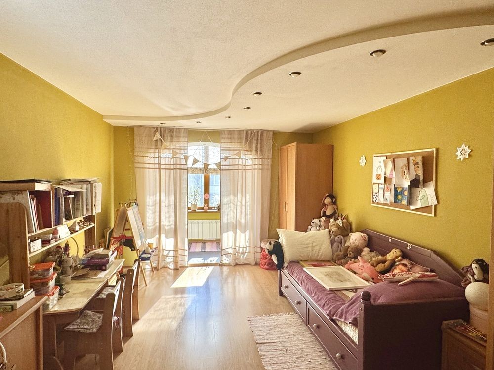 Планировка: большая кухня (с барной стойкой), которая разделена на 2 зоны, 1-я приготовления, 2-я столовая+большая гостевая+взрослая спальня+детская спальная команата+ванная+коридор.