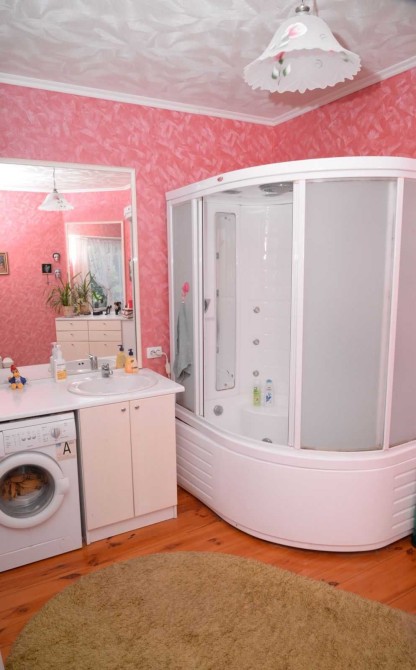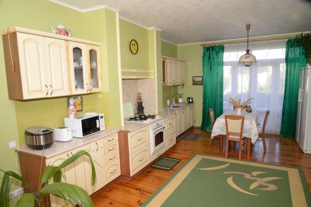 На першому поверсі вітальня- 28,2м., дві спальні 24м та 12,8м, кухня- 18,1м , обладнана всім необхідним, простора ванна кімната 12,7м, а також гардеробна та котельня.