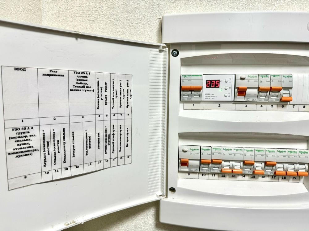 Проводка медная, распределительный щиток, реле напряжения, автоматы Schneider.