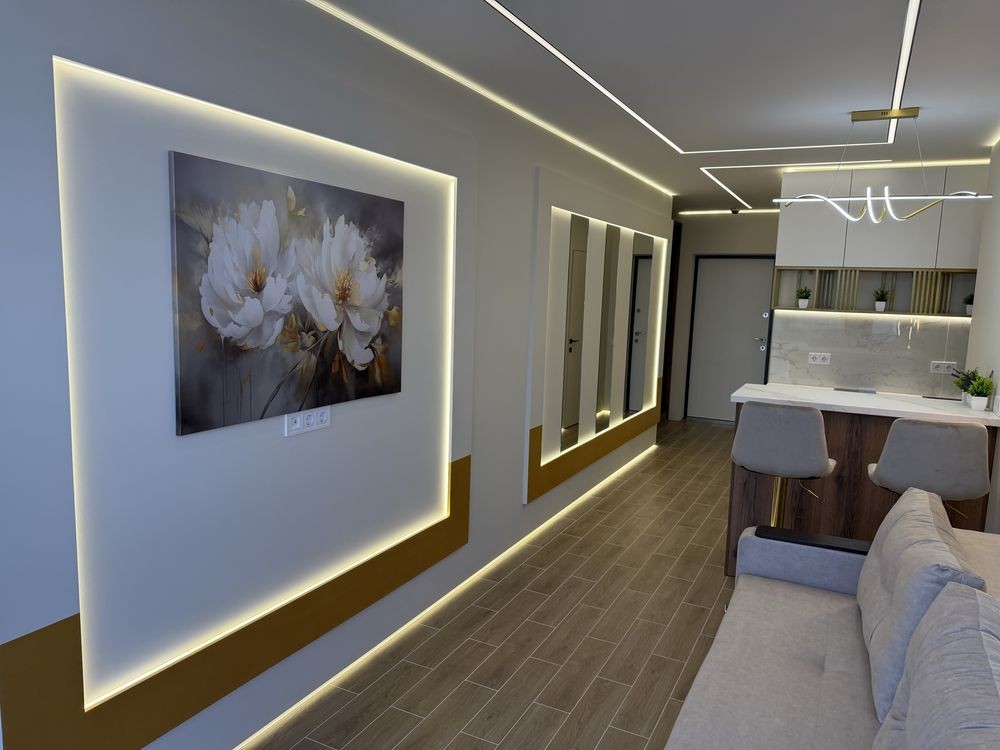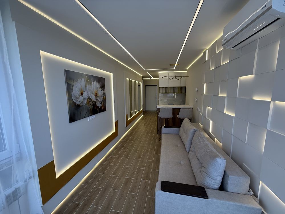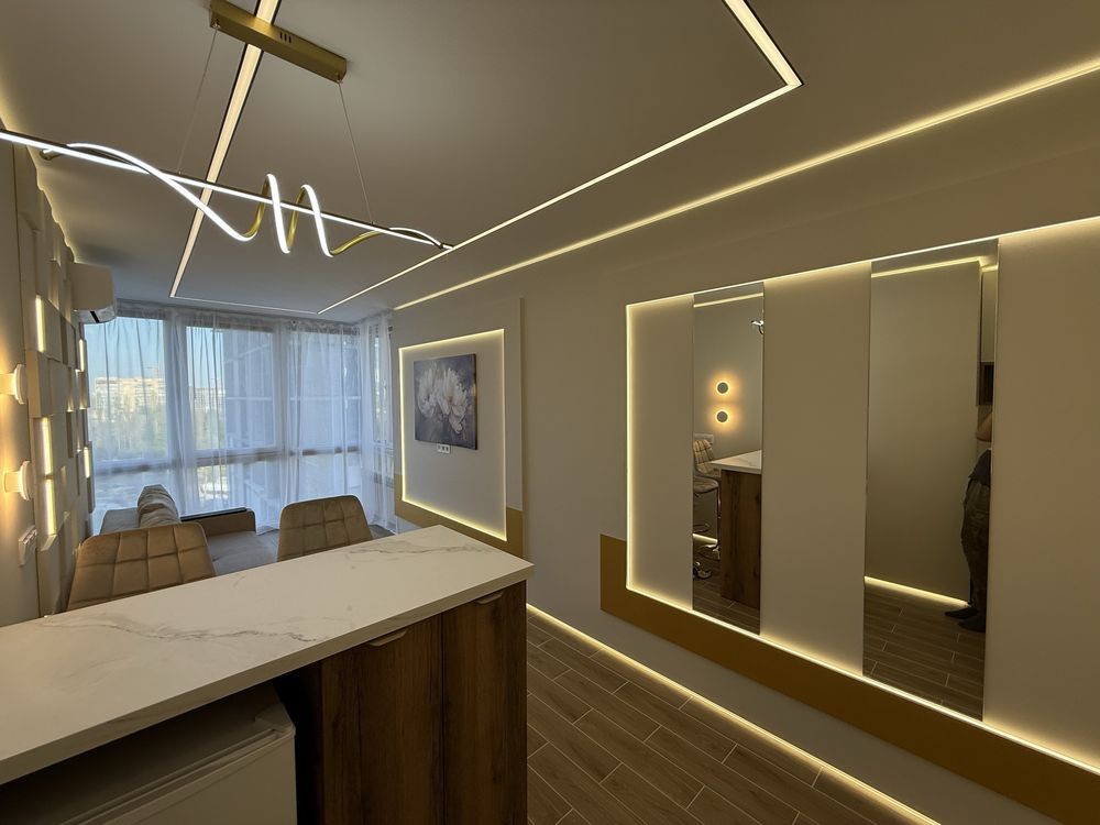 У квартирі виконано якісний ремонт. Дизайнером продумано оптимальне ергономічне планування та інтер'єрне рішення. Квартира красива, затишна та дуже світла. Панорамні вікна. Стильні м'які меблі та спеціально спроектовані для проекту корпусні меблі. За рахунок 3Д оздоблення стін і багатошарового LED-освітлення, smart-квартира візуально виглядає досить просторою. Тепла підлога для вашого комфорту.