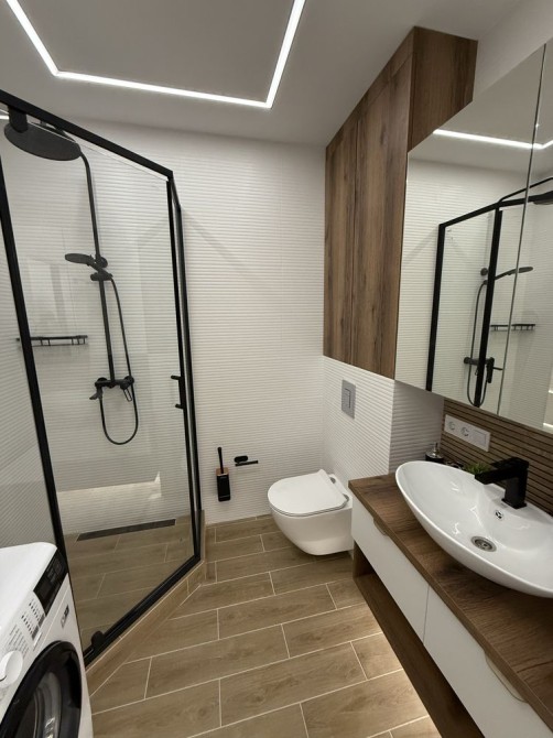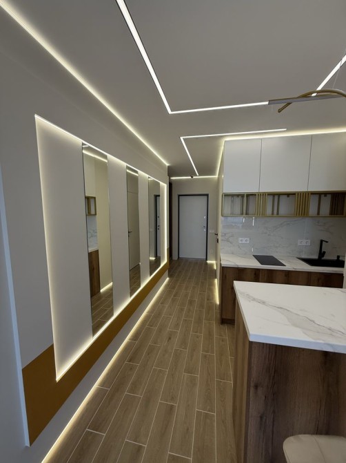 Всі Меблі і Техніка нові: кухня, варильна поверхня, барна стійка, барні стільці, м'який розкладний диван, велика шафа-купе, дзеркала в повний зріст, душова кабіна, посудомийна машина, бойлер, холодильник, індукційна варильна поверхня, пральна машина, кондиціонер.