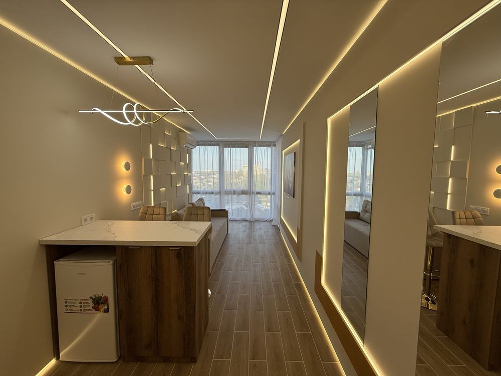 Квартира розташована на 11 поверсі 27-поверхового нового будинку. Загальна площа 26 м2. Продумане ергономічне планування. Дизайнерський дорогий ремонт. Все нове. Панорамні вікна. Багато дзеркал. Насичене освітлення. Захоплюючий вид з вікна. Дуже красива і світла квартира.