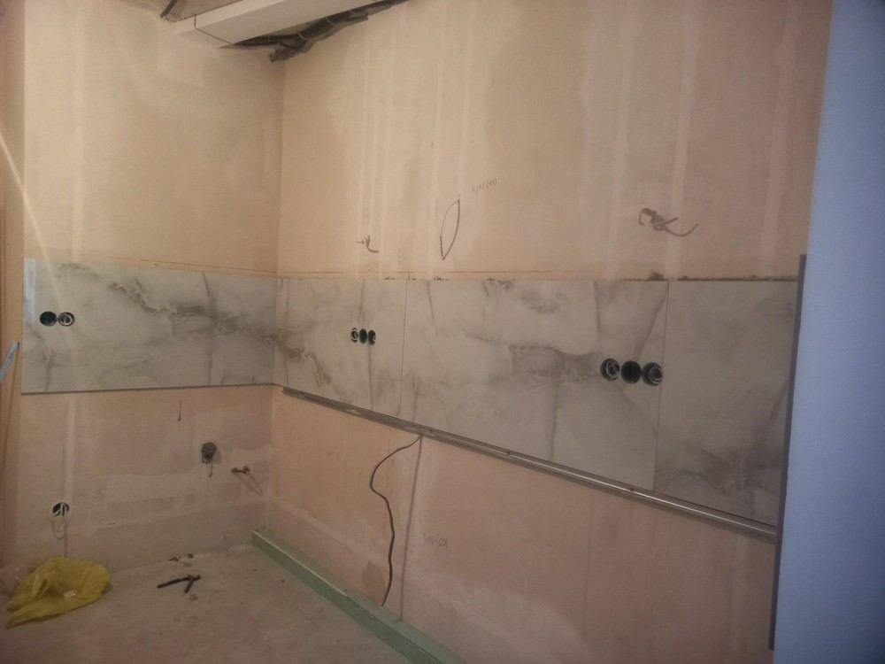 - в доль рабочей зоны на кухне выложена кирамическая плитка в формате 60х120;