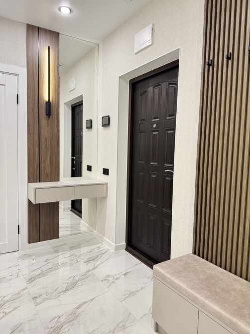 В квартире выполняется качественный дизайнерский ремонт (крашеные кухонные фасады, доводчики, бельгийский моющийся обои, LED освещение, Теплые полы, видео домофоны, электро фурнитура Schneider Electric Франция, стирально/сушильная машина, премиальная бытовая техника (Бош, Горенье). Есть вариант уменьшить стоимость за счет неполной комплектации квартиры.
