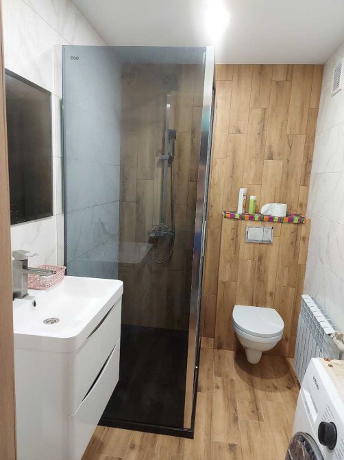 Повністю оновлена сантехніка. Тропічний душ-бокс. Інсталяція. Підвісний унітаз та раковина. Підлога — плитка керамограніт, стеля — натяжна, стіни — кахель. Освітлення — світлодіодне.