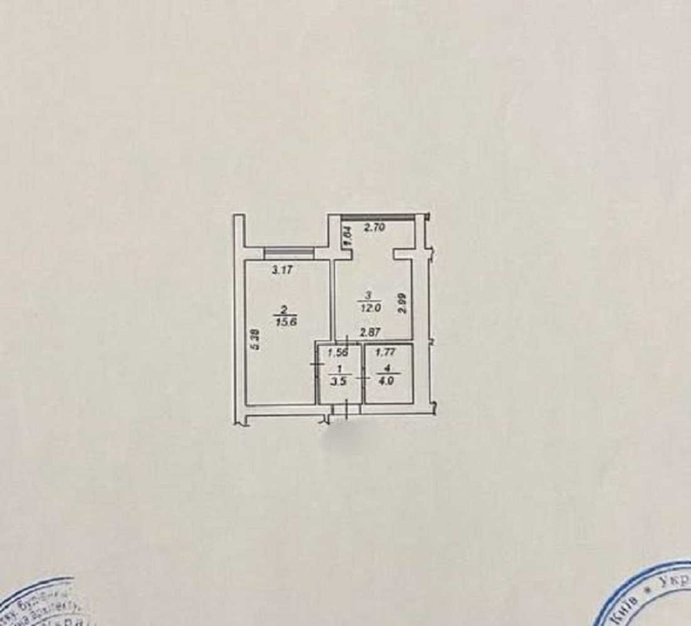 Загальна площа-35.1 кв.м, житлова площа- 15.6 кв.м, площа кухні-12 кв.м