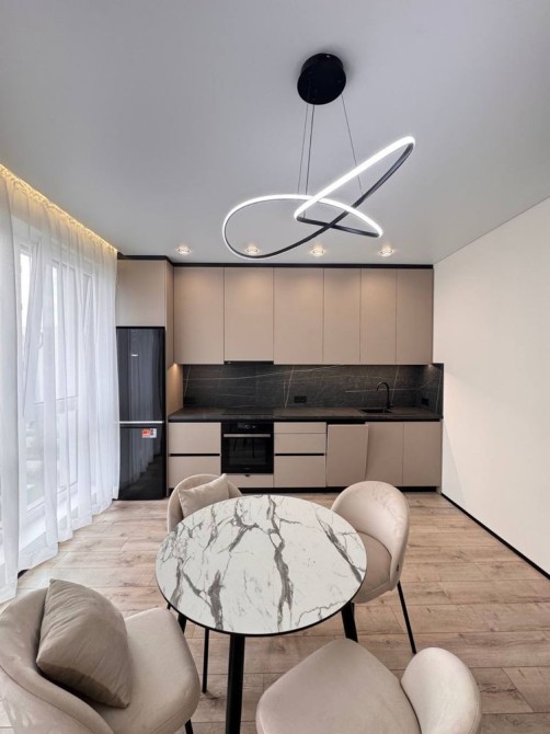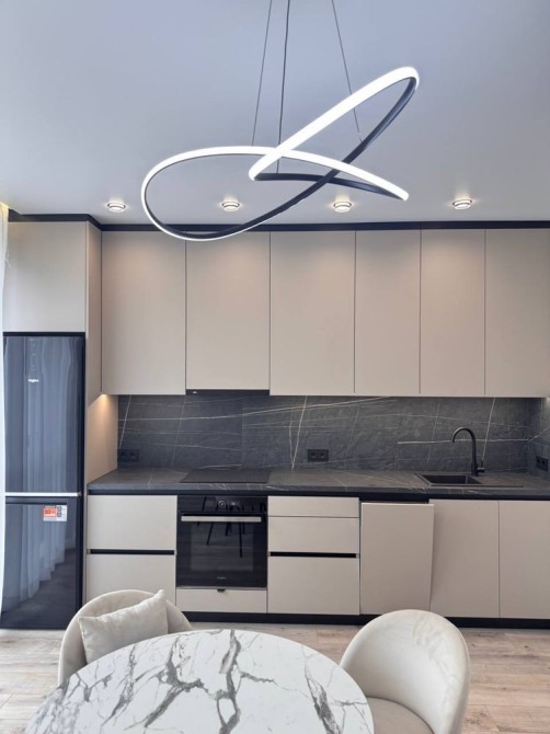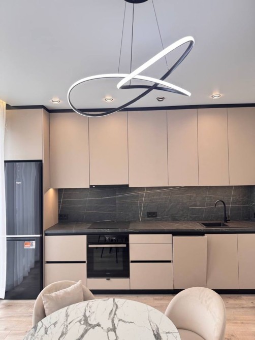 Простора кухня вітальня з вмонтованою кухнею та всією необхідною технікою.