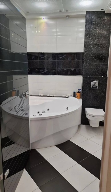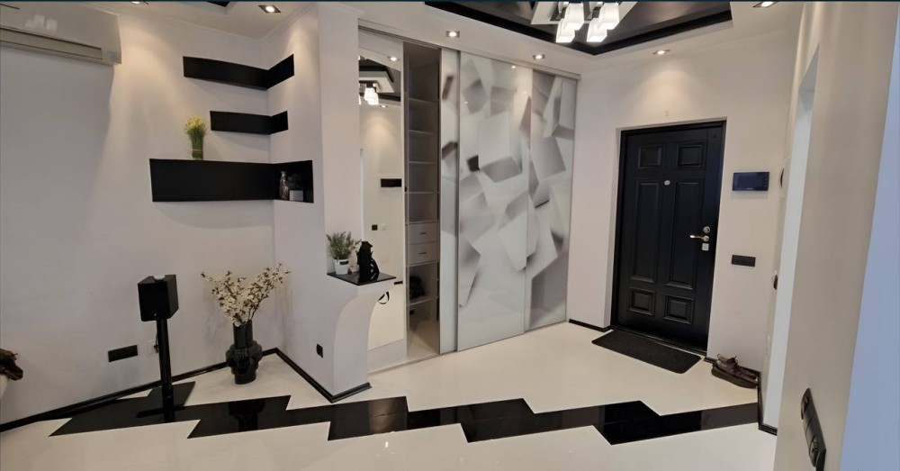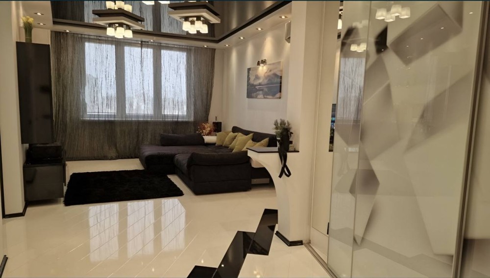 Квартира з якісним дизайнерським ремонтом: натяжні стелі, кахельна підлога, тепла підлога у санвузлі. Встановлені нові металопластикові вікна. У коридорі — тамбур на дві квартири з відеодомофоном, а також простора вбиральня для зберігання речей.