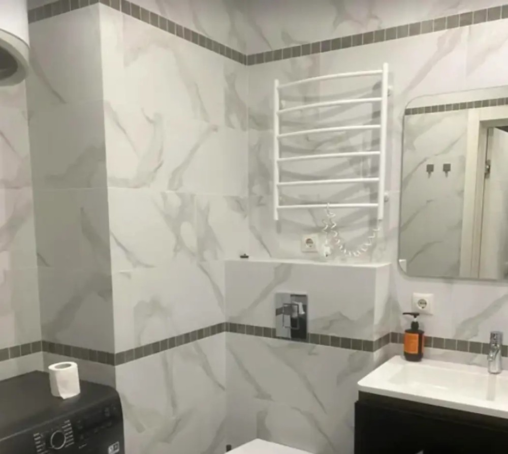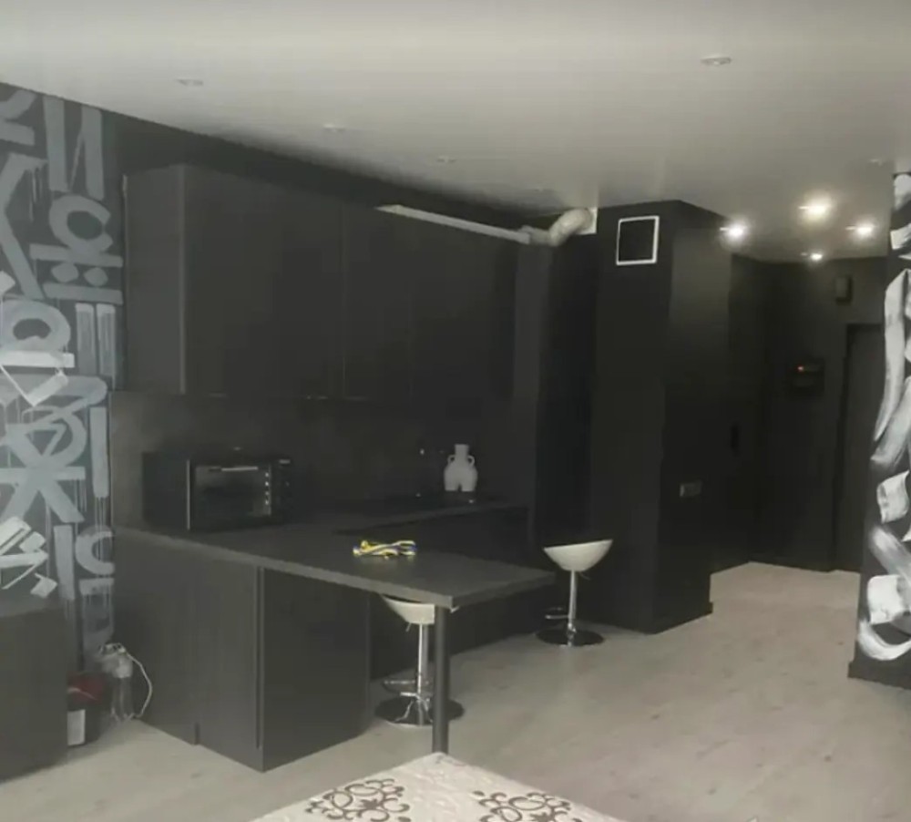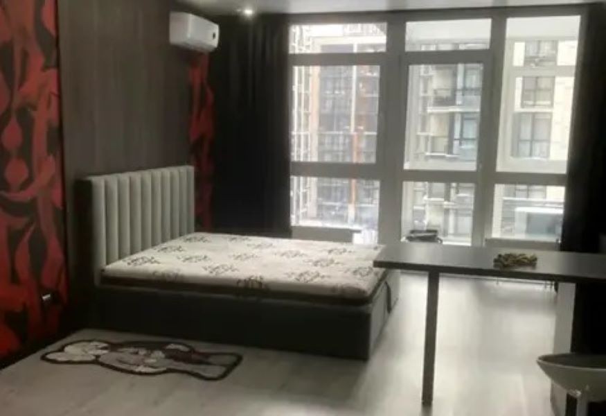 Квартира укомплектована всіма необхідними меблями та технікою: двоспальне ліжко, холодильник, варильна поверхня, витяжка, пральна машина.