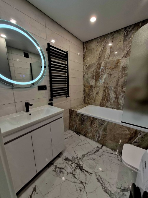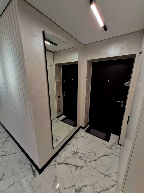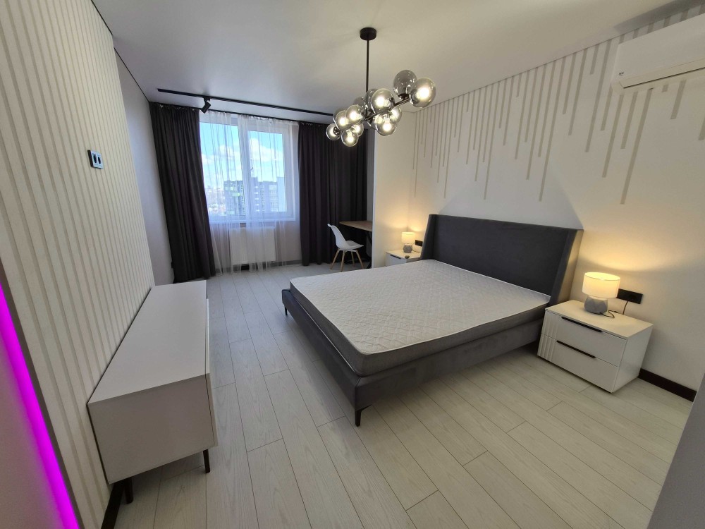 Квартира буде повністю укомплектована меблями і побутовою технікою, підгрів підлоги в коридорі, санвузлі та на кухні, кондиціонер, посудомийка і тд. Повністю готова квартира буде до Нового року.